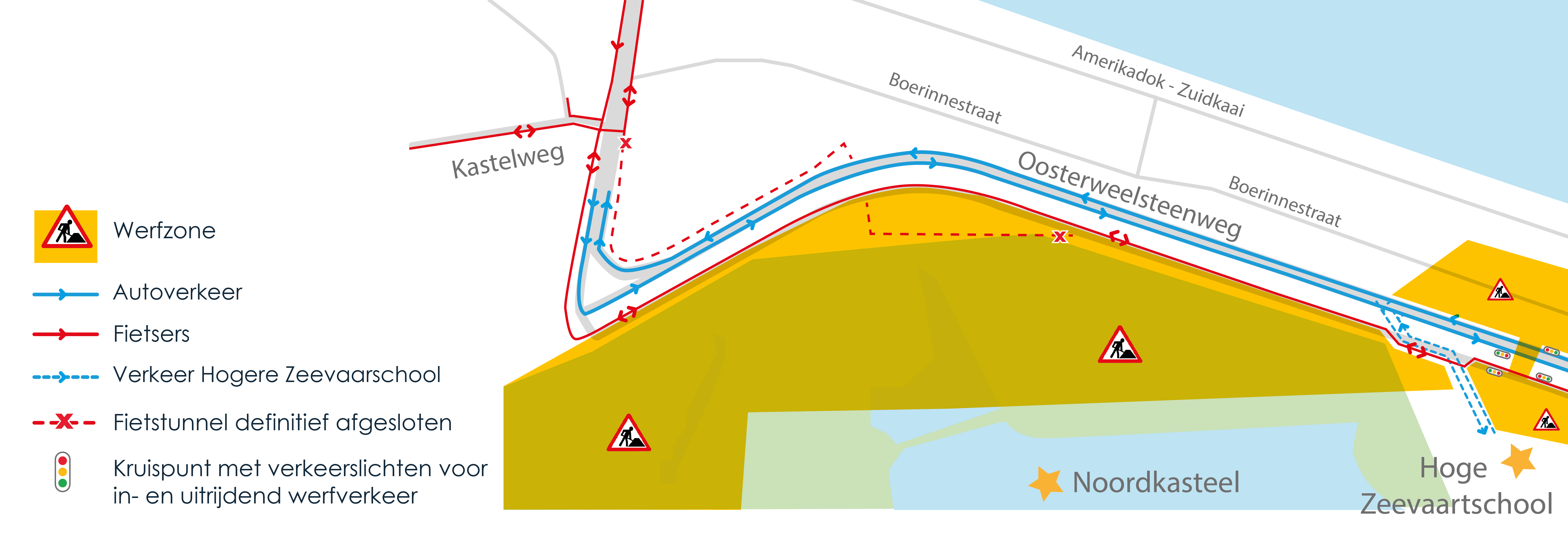 Rijd je van of naar de Hogere Zeevaartschool? Dan blijft de huidige inrit nog behouden tot 17 februari. Vanaf dan verleggen we die inrit meer richting haven. Op de locatie van de huidige inrit plaatsen we tijdelijke verkeerslichten. Deze geven standaard groen licht aan het doorgaand verkeer en de doorgaande fietsers van de Oosterweelsteenweg, maar dienen om werfverkeer veilig te laten in- en uitrijden.