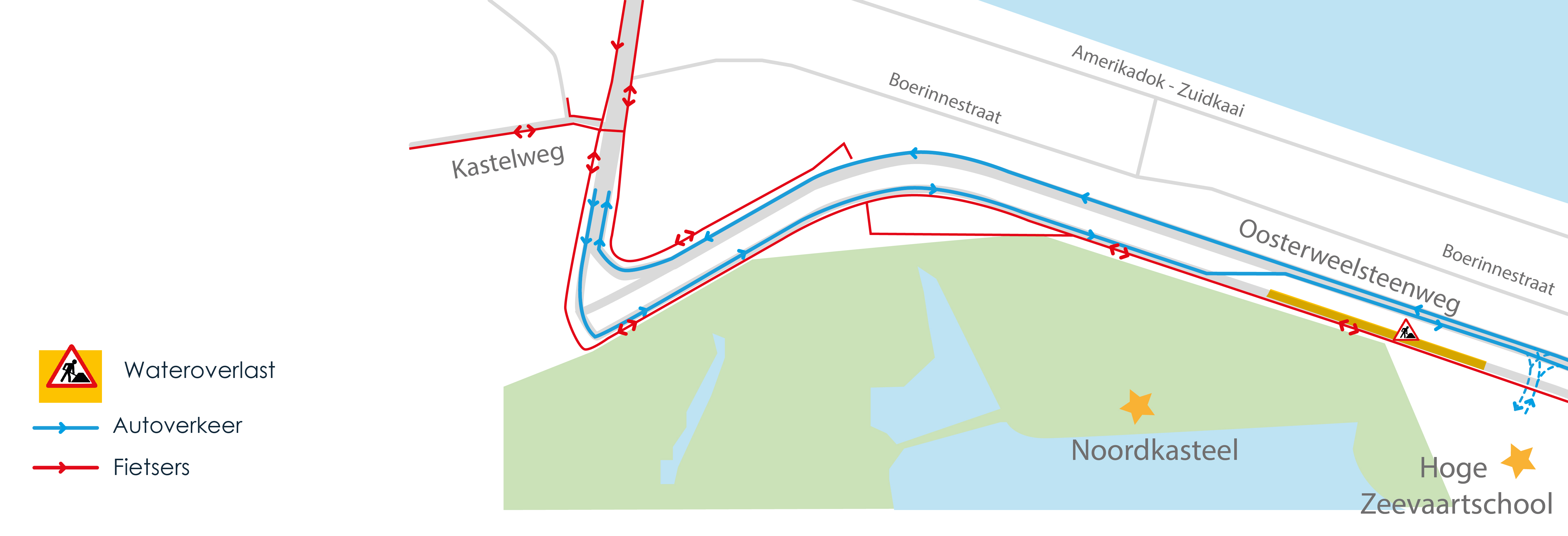 Op de Oosterweelsteenweg tussen de Kastelweg en Royerssluis, merkten we dat er bij hevige regenval wateroverlast was op de rijbaan richting Stad/Royerssluis. Het Agentschap Wegen en Verkeer kwam de rioleringsputjes meerdere keren reinigen, maar dat bracht geen beterschap. Het probleem blijkt hier dus dieper in de riolering te zitten. Wanneer het wegverkeer zich een weg baande door het water op de rijbaan, was het risico voor de fietsers op het fietspad ernaast te groot. Ook voor het wegverkeer zelf zou een natte periode met lage temperaturen gevaarlijke situaties kunnen opleveren. Om de vele fietsers en het wegverkeer hiertegen te beschermen, werd besloten om wegverkeer in beide rijrichtingen over de noordelijke rijbaan te sturen.